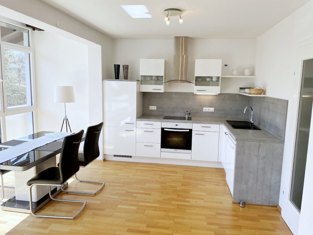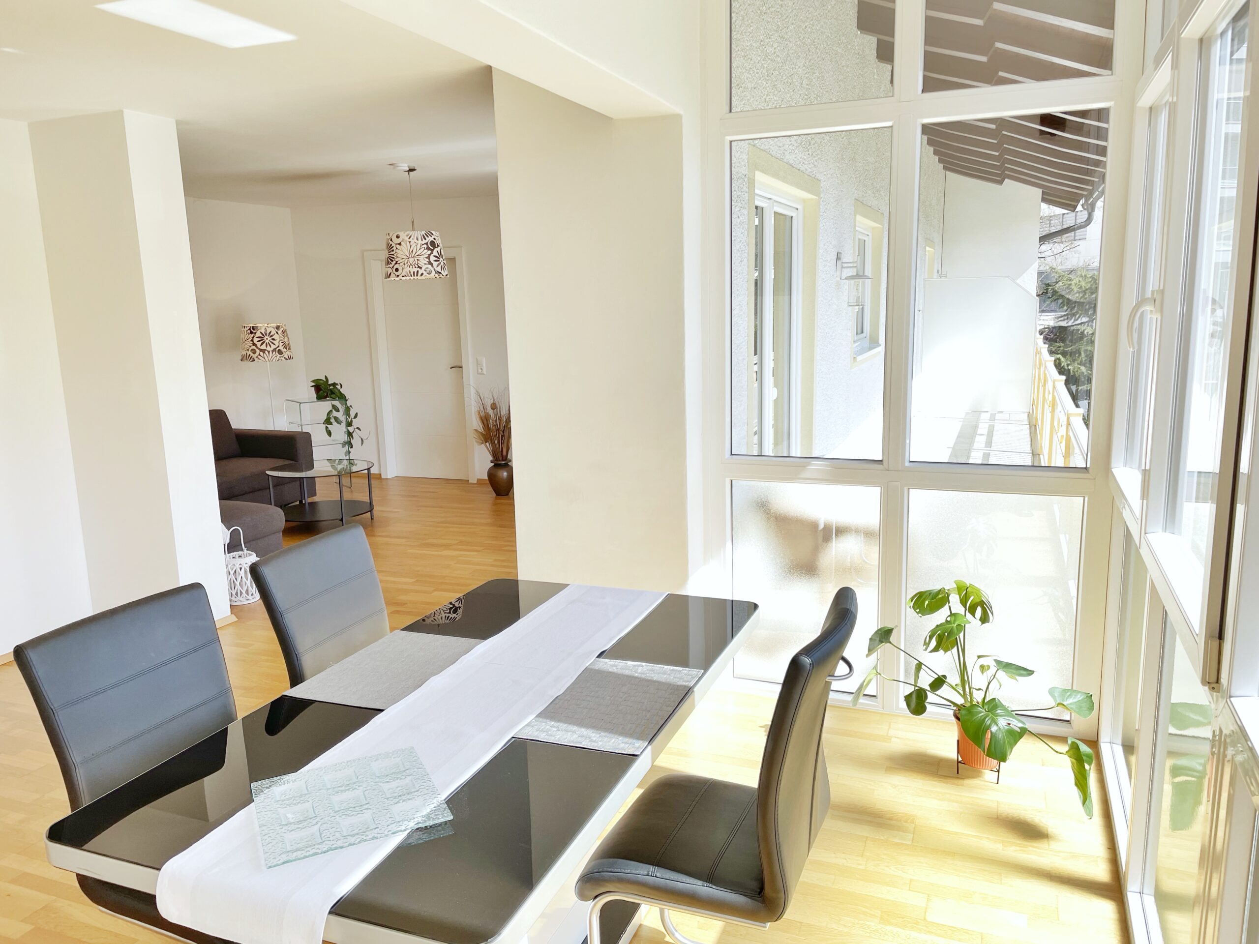 Die lichtdurchflutete Wohnung mit großer Fensterfront im Wohn- und Essbereich bietet modernen Komfort: offener Küchenbereich, separates Schlafzimmer, Schrankraum, zwei WCs, stilvolles Bad und ein überdachter Balkon für sonnige Auszeiten.